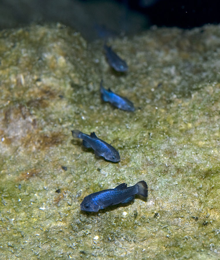 The iridescent blue fish are the remnants of a pupfish population that lived in the vast ice-age lake that filled Death Valley thousands of years ago. When the lake shrank, isolated pupfish groups persisted in rivers and ponds, becoming separate species.