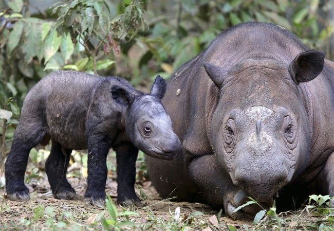 FILE - In this June 25, 2012 file photo, female Sumatran rhino named Ratu, right, is seen with her newly-born calf at Way Kambas National Park in Lampung, Indonesia. AP Photo/File